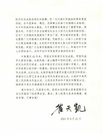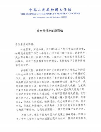 崔天凱大使致全美僑胞的辭別信