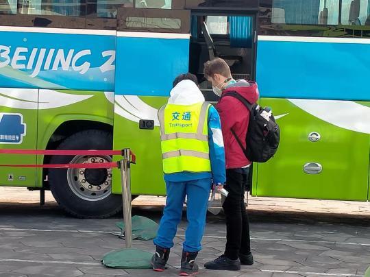 在每次比賽結(jié)束后的一段時(shí)間,擺渡班車站點(diǎn)前會赫然排起長隊(duì)。不少記者對照著手機(jī)抬頭查看班車站牌。兩位志愿者迎了上去,為大家指引路線。