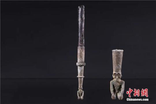 國(guó)字山墓葬中出土的青銅跪坐人鐓。中新社發(fā) 江西省文物考古研究院 供圖