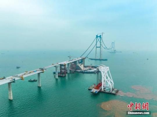 資料圖:1月4日,運架一體船正在架設深中通道非通航孔橋最后一片箱梁。中新社發(fā) 蘇振飛 攝