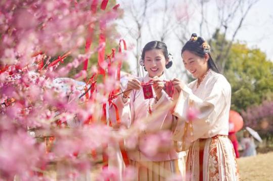 3月8日,浙江省湖州市長興縣,女性職工們在枝頭掛上祈福牌。中新社發(fā) 吳拯 攝