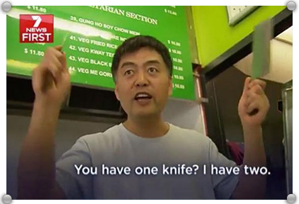 劇情梗概:19歲的匪徒持刀走進(jìn)面館,以紙條表明自己的來意“我有一把刀,給我錢。”面館的華人老板以去取錢為由從廚房拿出兩把大菜刀,喊道:“你有一把刀,我有兩把!”,劫匪立刻被嚇得腿軟,跑出沒多遠(yuǎn)連人帶刀被抓個(gè)正著。