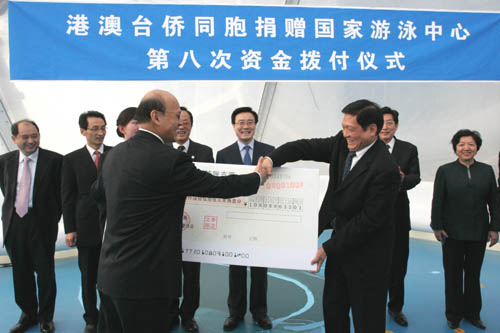中國僑網(wǎng)消息:1月28日上午,在剛剛竣工的國家游泳中心內(nèi),北京市港澳臺(tái)僑同胞共建北京奧運(yùn)場(chǎng)館委員會(huì)舉行第八次向國家游泳中心撥付捐款資金儀式。截止目前,“水立方”已收到來自102個(gè)國家和地區(qū)的35萬多位港澳臺(tái)僑同胞9.3億多元人民幣的捐款。
