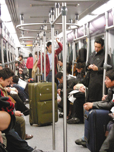 學(xué)生放假、大批在上海工作的職員踏上返鄉(xiāng)路途,原本在高峰時(shí)段人滿為患的地鐵也難得“清閑”下來。在昨天晚上7點(diǎn)15分左右的地鐵上,隨時(shí)可見大包小包返鄉(xiāng)者。除了在地鐵?康幕疖囌靖浇舷驴土鬏^多外,其余站點(diǎn)人流相對稀疏,有的車站甚至只有寥寥幾名乘客候車。