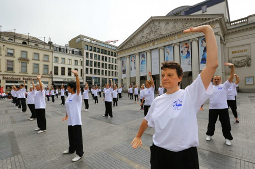 據(jù)新華社客戶端報道,7月16日一大早,西歐小城比利時布魯塞爾涼風習習。在市中心附近的比利時皇家鑄幣局劇院前的廣場上,近60名來自歐洲數(shù)國的健身氣功愛好者在此呈現(xiàn)了一場精彩的大型健身氣功展演,吸引了路人駐足欣賞。