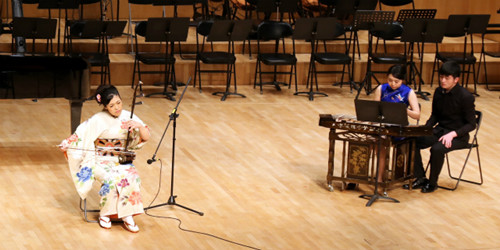 日本二胡的興起,源于上世紀80年代中期,一大批中國二胡演奏家、教育家乘改革開放之風東渡日本,在舉辦各種音樂會的同時還奔走于日本全國各地教學,并于2005年成立了日本二胡振興會。為了這次音樂會,專程由日本九州、東京和高知縣趕來的劉福君、武樂群、甘建民以及趙景明先生,他們在日本生活了二十余載,常年如一,孜孜不倦,培養(yǎng)了大批日本本土二胡人才。音樂會由于時間限制,他們將獨奏讓給了自己的弟子們,甘當幕后英雄。四位先生同青年一代的田宇、宋碩老師共同演繹了劉福君根據(jù)沖繩民間音樂風格創(chuàng)作的二胡重奏曲《島之風》,可謂珠聯(lián)璧合,情深意長。
