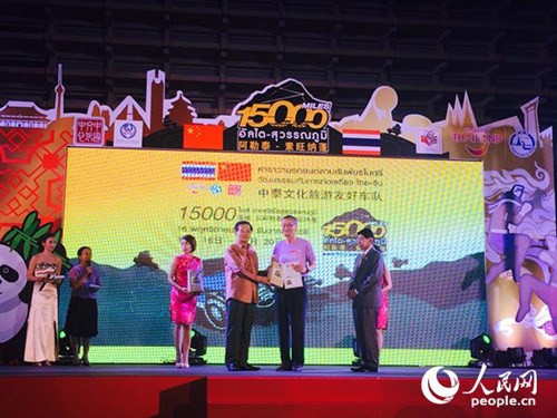 “2015中泰文化旅游友好行”車隊于12月13日順利抵達(dá)曼谷,受到泰國各界人士的熱烈歡迎。慶祝活動13日當(dāng)天在曼谷中國文化中心舉行,中國駐泰國大使寧賦魁和泰國副總理威沙努·克安、泰國前副總理泰中文化促進(jìn)委員會主席披尼·扎祿頌巴、泰國國家旅游局副局長蘇力·習(xí)提尼、副局長悉素達(dá)·翁姘諾薩、中國-東盟中心秘書長楊秀萍,以及泰國各界嘉賓200余人參加了慶?;顒印M撑笨偫?、寧賦魁大使和楊秀萍秘書長分別在活動上致辭,并為參與者頒發(fā)證書和紀(jì)念品。