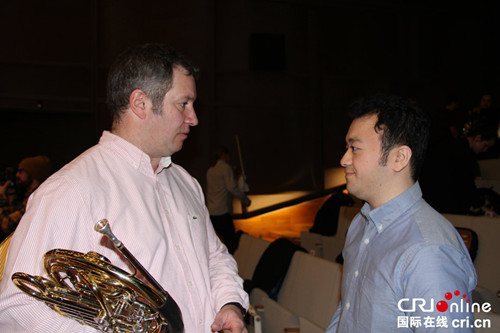 其實(shí)最早創(chuàng)作時(shí),作品是為圓號(hào)和室內(nèi)樂團(tuán)設(shè)計(jì)的,后來發(fā)現(xiàn)這個(gè)音樂是交響樂性質(zhì)的,所以代博重新進(jìn)行了配器,使弦樂的聲音變得更為厚重,一定程度上更能體現(xiàn)出作品的深邃,但同時(shí)會(huì)產(chǎn)生很多新的問題,包括肢體上的問題,整個(gè)樂隊(duì)的配合有更多的困難,樂隊(duì)與圓號(hào)之間的呼應(yīng)使得這個(gè)作品現(xiàn)在更具有交響性。圓號(hào)演奏者斯蒂凡·多爾是來自柏林愛樂樂團(tuán)的首席圓號(hào),是世界上最優(yōu)秀的演奏家,他對(duì)音樂有獨(dú)到的見解,為了更好地理解代博的音樂,據(jù)說,他還閱讀了密茨凱維奇的詩。“作為一名表演者,我感受到了這首曲子的是很有張力的,有很多的音樂語言,非常的豐富多彩。觀眾們會(huì)非常享受的?!?湯黎)