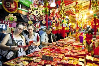 每逢農(nóng)歷新年,新加坡的各大商場和購物中心張燈結(jié)彩,恭賀聲不斷。其中,以牛車水最為熱鬧,年貨市場從除夕前幾個星期就開始營業(yè),鄰近街道擠得水泄不通,每年固定舉辦的新春亮燈活動更長達1個月,馬路上架起高高的牌樓花燈,在夜里顯得特別燦爛。