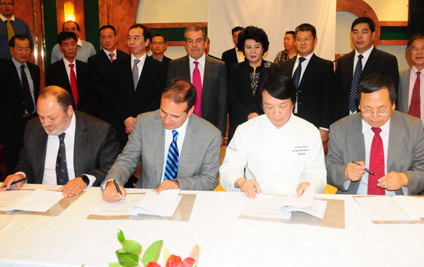 在送年飯活動(dòng)的同時(shí),裘援平為智利“華助中心”進(jìn)行授牌,并見(jiàn)證了智利推動(dòng)“中餐繁榮計(jì)劃”合作意向協(xié)議的簽定儀式。