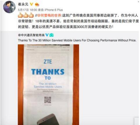 但是在大洋彼岸的美國,中興手機卻賣得風(fēng)生水起,今年五月還登上了《華爾街時報》整版。