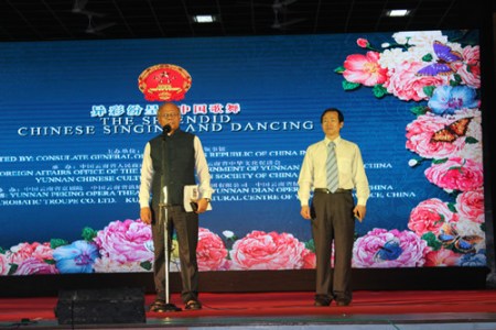 中國僑網(wǎng)8月23日電 據(jù)中國駐加爾各答總領(lǐng)館消息,近日,中國駐加爾各答總領(lǐng)館邀請云南省中華文化促進(jìn)會演出團(tuán),來到久負(fù)盛名的印度和平鄉(xiāng)國際大學(xué),為該校師生上演了一場“異彩紛呈的中國歌舞”文藝演出。