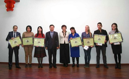 孫大使首先向中華文化中心以及塔什干東方學院、塔什干輕工紡織學院附二中、59中學等學校對“快樂中國行”活動的大力支持和協(xié)助表示感謝,向獲獎老師和同學表示祝賀。孫大使提出三點希望,希望參與“快樂中國行”的師生們能夠收獲快樂、增長知識和傳遞中烏友誼。孫大使在講話中強調(diào),明年是中烏建交25周年,我們不僅要繼續(xù)辦好“快樂中國行”活動,還會想出更多辦法、開拓更多渠道,促進中烏兩國青少年的相互交往,讓中烏友誼世世代代傳承下去。