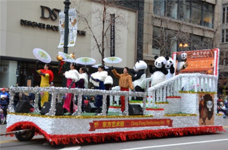 芝加哥東方藝術(shù)團(tuán)的眾多舞蹈愛好者在花車上下展示美輪美奐的京劇服飾和旗袍,美國民眾喜愛的大熊貓一路相伴,歡快的中國節(jié)日音樂環(huán)繞左右,喜氣洋洋。