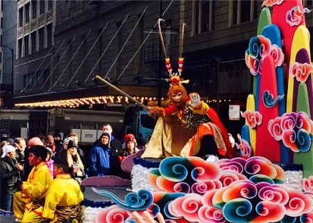 芝加哥希林華星藝術(shù)團(tuán)的花車主打“美猴王”形象,“小猴王”簇?fù)碓凇懊篮锿酢鄙磉?,矯健的身手和精湛的中國功夫表演成為游行隊(duì)伍中的明星。