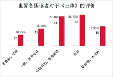 在作品風格和故事情節(jié)的分析中,有27.18%的人明確提到了“中國科幻小說”,有28.72%的讀者認為“很好”,17.95%的讀者認為《三體》是“最好的”“杰出的”小說,三項合計為73.85%,恰好印證了2萬多讀者給《三體》打出4分、5分的人數(shù)比例??梢姟爸袊苹谩毙≌f、“非西方風格”是《三體》贏得世界上這么多讀者青睞的主要原因。比如有個英國讀者寫到:“作為一個英語國家的讀者,我讀的大部分小說都是西方式的或者英語國家式的。這部小說讓我讀起來感覺很新鮮,人物不再是常見的美國式的、英國式的或者歐洲式的,也不是澳大利亞式的。讀劉慈欣的書,既是閱讀一部包含中國歷史文化的科幻小說,也是閱讀一部不以英語國家和說英語的人物為中心的小說?!庇忻绹x者寫道:“沒有讓我失望,與我讀過的科幻小說很不一樣,期待閱讀下一部?!薄拔液芟矚g這部小說,它充滿了令人驚喜的科學概念,此外小說中的觀點是非西方式的?!?/p>