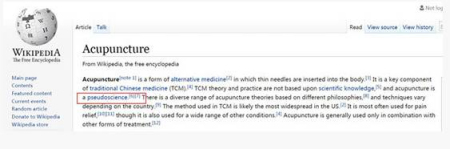 針灸是中國醫(yī)學(xué)遺產(chǎn)的一部分,也是中華文化的一部分。但是,維基百科認(rèn)為針灸屬于偽科學(xué),在針灸英文頁面上赫然列明:“acupuncture is a pseudoscience” (針灸是偽科學(xué))。