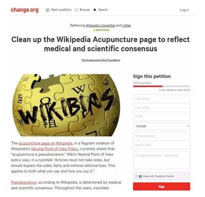最近,有超過2500個(gè)中醫(yī)師在請(qǐng)?jiān)笗W(wǎng)頁簽名抗議,要求維基為此更正。簽名者并非只是華人,而是來自全世界各地不同族裔的醫(yī)師和通過針灸治愈疾病的人。