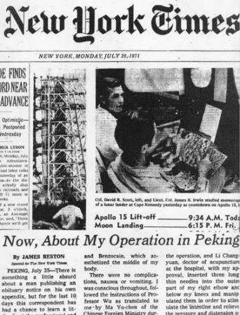 1971年7月,《紐約時(shí)報(bào)》專欄作家詹姆斯·賴斯頓在訪華時(shí),患了急性闌尾炎。術(shù)后第二天,腹部脹痛難忍,中國醫(yī)生為他做了針灸治療,效果顯著。隨后,賴斯頓在《紐約時(shí)報(bào)》頭版發(fā)表了親身經(jīng)歷針灸的文章,成為針灸傳入美國的歷史性標(biāo)志。