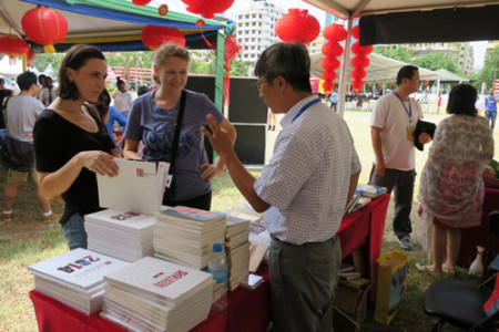 新春廟會現(xiàn)場張燈結彩,樂音悠揚。坦桑尼亞中國文化中心以《絲路新韻》圖片展、中國美食雕刻藝術展示、寫春聯(lián)、學剪紙、書法體驗、文化圖書展銷等豐富內容宣傳中國文化,推介“一帶一路”倡議給中坦文化、經(jīng)貿往來帶來的良好機遇。廟會活動熱鬧非凡,有的觀眾著迷于精美的果蔬雕刻,連續(xù)兩天都來到中心展位觀賞;有的觀眾頂著烈日,排隊領取自己所屬生肖的卡通圖案貼紙;有的觀眾流連往返于書籍展臺前,為終于淘到了心儀的中國版圖書,或得到了春聯(lián)和燈籠而滿心歡喜。
