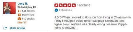 而在Yelp(相當(dāng)于國內(nèi)的大眾點(diǎn)評)網(wǎng)站上,Pepper Twins的總體評價是四星,但很多顧客在下面的點(diǎn)評里給了五星,并且不吝贊美之詞。