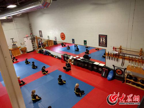 我看了兩個(gè)班的訓(xùn)練:一個(gè)是年齡小的,在二樓看去,20個(gè)男女小學(xué)員中只有四五個(gè)華人小朋友,他們跟著教練學(xué)扎馬步、推掌、踢腿等靈活招數(shù)。第二波人數(shù)多一些,都是些大一點(diǎn)的少年且是清一色的歐裔白種人,教練換成男的,很有一些威武氣派。