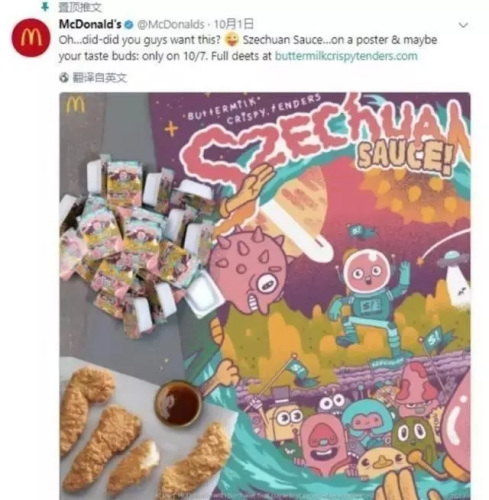 1日,麥當(dāng)勞在其官推宣布, 10月7日這天,將在部分美國(guó)門店限量供應(yīng)這款19年前曾隨麥香雞塊附送的四川辣醬:“哦,你想要它嗎?四川辣醬……在海報(bào)上,或在你的嘴里!僅限10月7日?!?/p>