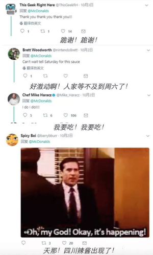 消息一出,19年前曾被來(lái)自中國(guó)四川的“神秘醬料”驚艷到的美國(guó)朋友們喜不自勝,紛紛奔走相告,感謝麥當(dāng)勞讓這款醬料重現(xiàn)江湖。