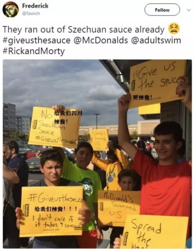 原來(lái),醉翁之意不在酒。人民群眾把M記圍得水泄不通,目的根本不在雞塊,而在隨雞塊附送的限量蘸醬——四川辣醬(Szechuan Sauce)。
