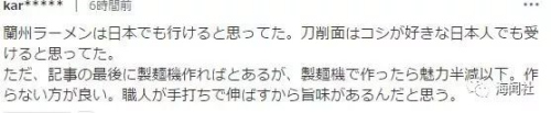 我以前就覺得蘭州拉面能在日本賣。刀削面也會(huì)讓一些喜歡勁道的日本人接受。但是文中記者說(shuō)希望有做蘭州拉面的機(jī)器,要是用機(jī)器做會(huì)讓它失去一大半魅力。還是別做機(jī)器了。我覺得只有師傅手工做的才香。