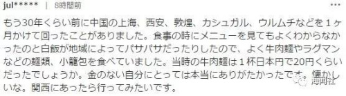 對(duì)于喜歡面類的這位日本記者來(lái)說(shuō),“蘭州拉面”成為了救世主。便宜的時(shí)候能用10塊錢買到一碗,并且在車站等附近肯定能找到?;貒?guó)后,還因?yàn)槌圆坏教m州拉面而想念。