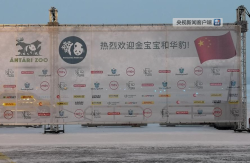 央視記者看到,機(jī)場(chǎng)停機(jī)坪豎起了一塊歡迎招牌,上面用漢字寫著“熱烈歡迎金寶寶和華豹!”,芬蘭電視臺(tái)記者已經(jīng)在雪中的機(jī)場(chǎng)守候。