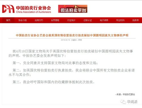 據(jù)中國(guó)拍賣行業(yè)協(xié)會(huì)網(wǎng)站4月11日消息,就英國(guó)坎特伯雷拍賣行拍賣疑似中國(guó)圓明園流失文物一事,中拍協(xié)藝委會(huì)聲明,完全同意并支持國(guó)家文物局對(duì)此事的態(tài)度和立場(chǎng),如英國(guó)坎特伯雷拍賣行執(zhí)意拍賣,將聯(lián)合中國(guó)所有文物拍賣企業(yè)承諾永不與其合作,呼吁國(guó)際和國(guó)內(nèi)的收藏群體抵制此次拍賣。