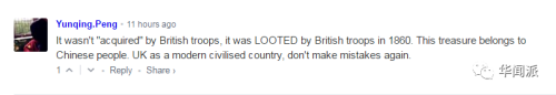 在網(wǎng)頁的下方就有中國(guó)網(wǎng)友評(píng)論到:“這根本不是英國(guó)軍隊(duì)‘獲得’(acquired),根本就是英國(guó)軍隊(duì)在1860年搶來(looted)的。這些寶貝是屬于中國(guó)人民的,英國(guó)作為一個(gè)現(xiàn)代文明國(guó)家,不應(yīng)該讓歷史重演?!?/p>