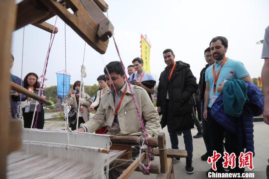 外國(guó)友人體驗(yàn)傳統(tǒng)紡織技藝 楊眉 攝