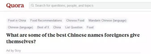 在國(guó)外知乎Quora上有人問(wèn)大家,有沒(méi)有很棒的中國(guó)的名字,結(jié)果下面有很多自認(rèn)為還不錯(cuò)的踴躍舉手發(fā)言。