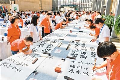 近百名中日韓青少年在百米長卷上書寫唐詩,以唐詩展現(xiàn)書法的魅力。(記者 郝鐘毓 攝)