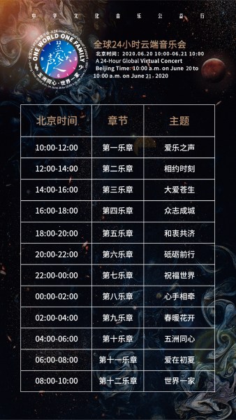 與此前許多的云端音樂(lè)分享活動(dòng)不同,本次音樂(lè)會(huì)24小時(shí)全球播出,從北京時(shí)間6月20日上午10點(diǎn)至6月21日上午10點(diǎn),不間斷地上演形式多樣的線(xiàn)上文化大餐,營(yíng)造多元化的音樂(lè)正能量,用音樂(lè)傳遞溫暖和力量。