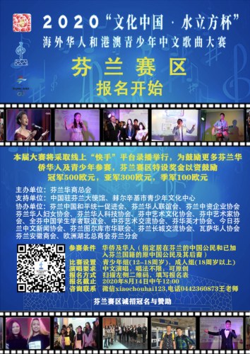 6.2020“文化中國•水立方杯”芬蘭華僑華人中文歌曲大賽將是一個(gè)集文化、修養(yǎng)、幸福、健康與快樂的大舞臺(tái)。歡迎芬蘭各位華僑華人朋友及其子女踴躍報(bào)名參加。報(bào)名請(qǐng)掃下面的二維碼,報(bào)名截止2020年8月14日12:00。