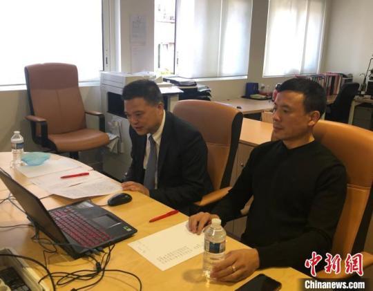 法國華僑華人會主席任俐敏(左)為2020“‘文化中國·水立方杯’海外華人和港澳青少年中文歌曲大賽”法國分賽區(qū)決賽致辭,法國華僑華人會第一副主席鄭金標(biāo)(右)出席觀看決賽?!W文 攝