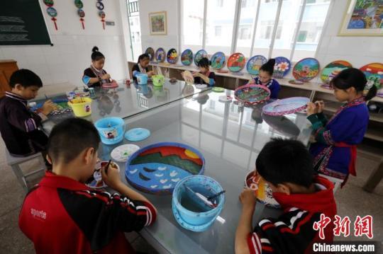 11月6日,在廣西三江侗族自治縣民族實(shí)驗(yàn)學(xué)校,學(xué)生們?cè)隰せ侠L制侗畫?!蔷殑住z