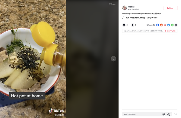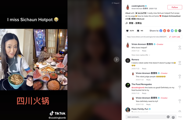 @cookingbomb 是一位美食網(wǎng)紅博主,中文名叫袁倩祎。她在TikTok上教外國(guó)人做中國(guó)美食,已收獲170萬(wàn)粉絲,平均每條視頻播放量數(shù)十萬(wàn)次。其中,一條懷念四川火鍋的視頻,收獲5萬(wàn)多點(diǎn)贊。留言區(qū)同樣有很多想吃火鍋的人。