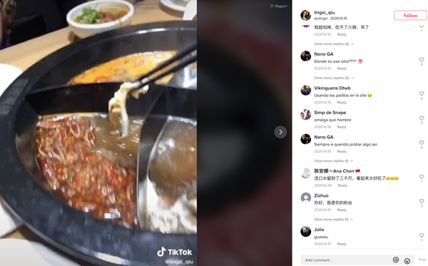華裔波蘭用戶(hù)@kuangtingwu 上傳了一小段吃火鍋的視頻,收獲了上千點(diǎn)贊。在西班牙生活的中國(guó)女孩@lingxi_qiu 上傳了自己吃火鍋的視頻,評(píng)論區(qū)里有很多葡萄牙語(yǔ)用戶(hù)留言,詢(xún)問(wèn)她是在哪里吃的。
