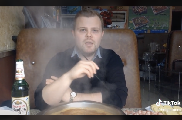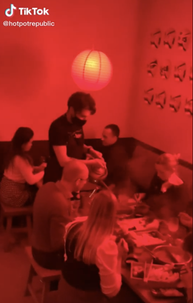 一條TikTok視頻記錄了這家北歐餐館里的火爆場(chǎng)景。紅色的燈光,墻上一張京劇臉譜,屋內(nèi)坐滿(mǎn)了外國(guó)人。他們有的兩人小聚,有的四五成團(tuán),圍坐在火鍋前。他們有模有樣地拿著筷子,仔細(xì)地從鍋里撈上肉,放進(jìn)醬料碟里蘸一下,再慢慢地送入嘴中。熱氣騰騰的火鍋前,大家說(shuō)著笑著,熱鬧非凡。