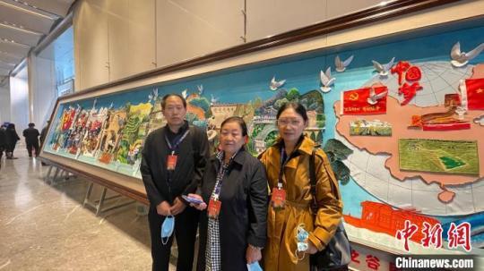 《在希望的田野上·鄉(xiāng)村振興·小康社會(huì)·百名農(nóng)民畫展》主題展區(qū),一幅長(zhǎng)8.4米,寬1.4米的大型工藝作品吸引了眾人圍觀拍照。作品主創(chuàng)之一、非遺刺繡布藝呂梁市級(jí)傳承人李拴林介紹,此作品由山西省中陽(yáng)縣夢(mèng)之谷民俗文化產(chǎn)業(yè)開(kāi)發(fā)專業(yè)合作社十多名繡工歷時(shí)四個(gè)多月設(shè)計(jì)制作,作品反映了在黨的領(lǐng)導(dǎo)下農(nóng)村發(fā)展變化的故事?!白髌窇?yīng)用了刺繡、布藝、泥塑等技法,融合浮雕、服裝工藝,多種藝術(shù)形式融合,形成立體效果明顯的工藝品?!?/p>