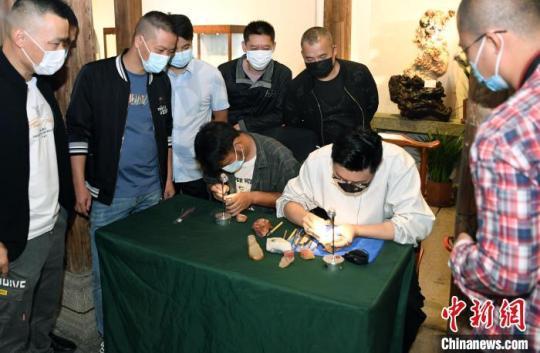 兩名青年雕刻師現(xiàn)場展示“非遺”壽山石雕刻技藝。記者劉可耕 攝