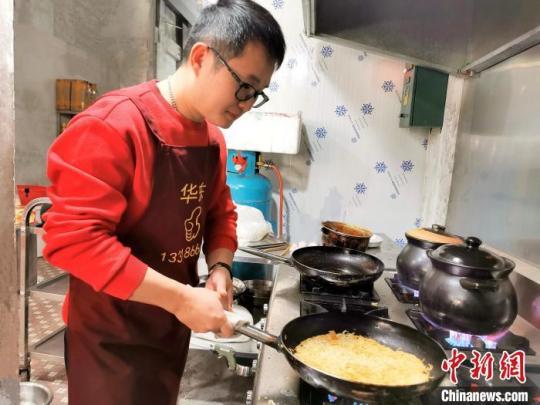 臺山市沖蔞鎮(zhèn)華東餐廳負責人伍樹波展示煎面 李曉春 攝
