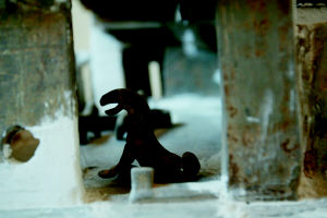 記者見到,這個陶制的四合園模型長60厘米,寬50厘米,高30厘米。門樓、東西廂房一應(yīng)俱全;東面是帶有月亮門的廚房,西面是倉庫;豬、羊在院子里享用著“美食”;一條狗蹲在門外,另外兩條看門犬則在門里的陰涼下蹲著;西北角的石磨有精致的磨眼、磨道;甚至院子里的排水設(shè)施都清晰可見;房頂板瓦、筒瓦排列有序,上面雕刻著精美的圖案。