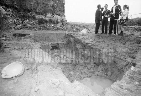 記者看到,工地上的大坑中,大大小小的墓穴一個連著一個,有的已經(jīng)初步清理出來了,有的還僅露出個輪廓,整體還被泥土埋在下面,顯得相當神秘(如圖)。記者在現(xiàn)場發(fā)現(xiàn)了兩座墓穴,都以合葬形式出現(xiàn),其中一個較小的墓穴,長度僅僅1米多,寬度約六七十厘米,正中被間隔開了,據(jù)現(xiàn)場一些圍觀群眾推測是衣冠冢。