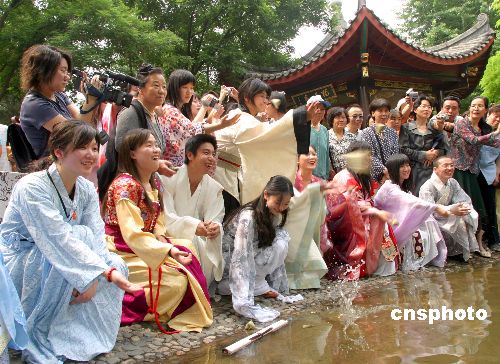 同樣是中國人民大學(xué)校園內(nèi),在孔子像前,該校歷史系大三學(xué)生張丹丹身著中式傳統(tǒng)服裝,在此舉行古代女子成年儀式——“笄禮”。隨著一曲悠揚(yáng)的《湘妃怨》,頭發(fā)散披的張丹丹身著一套淡黃色漢服,面南向觀禮賓行揖禮,然后跪坐席上梳頭盤發(fā)加笄,再將一套紅色的裙子加在她淡黃色漢服的外面。她跪灑酒水祭酒,再用嘴唇輕觸酒杯,再次跪拜正賓。張丹丹以中國人早已鮮見的“笄禮”,宣告自己長大成人。據(jù)知,儀式完全還原《朱子家禮》,從迎賓、置醴、醮子到笄者揖謝,共分十六個步驟。